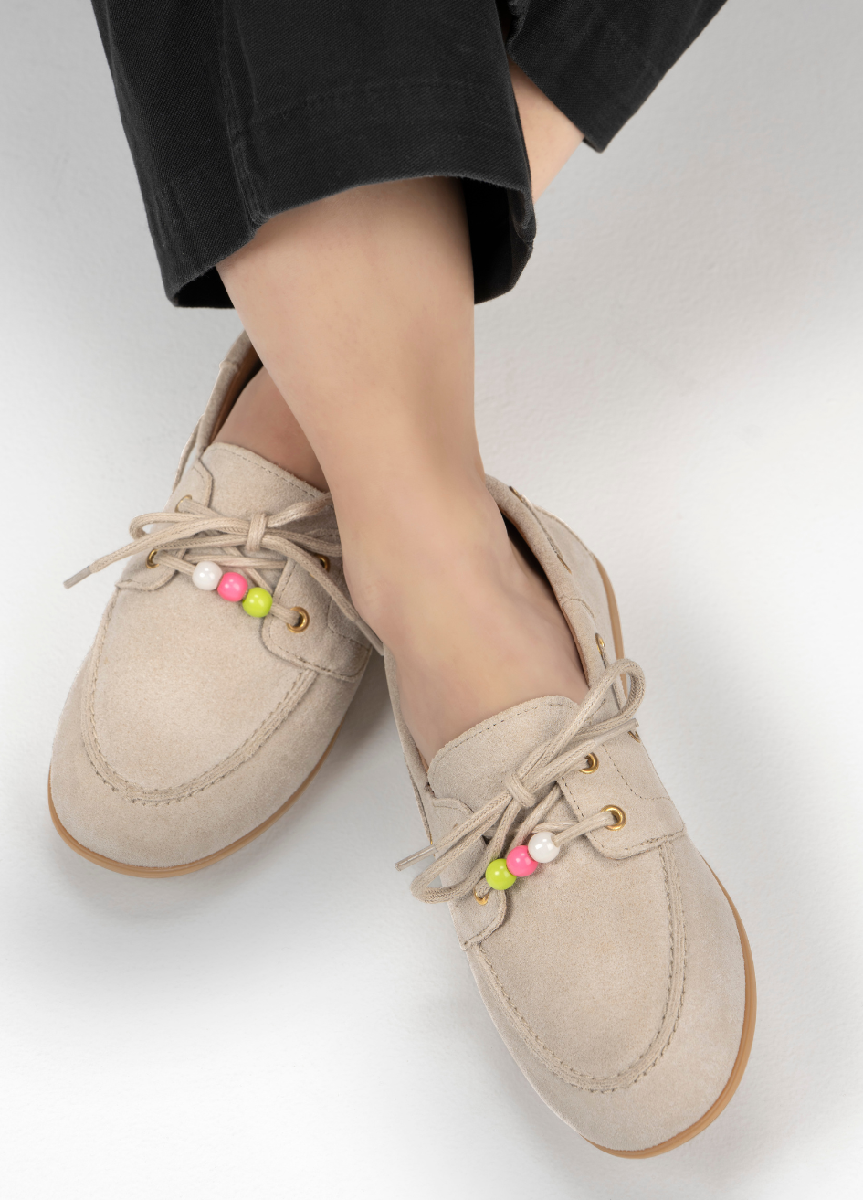 Deze supertrendy mocassin in de kleur champagne met fringes is razend populair! Dit is toch de perfecte schoen voor de zomer? Mix and match met kraaltjes of een gekleurde veter.
