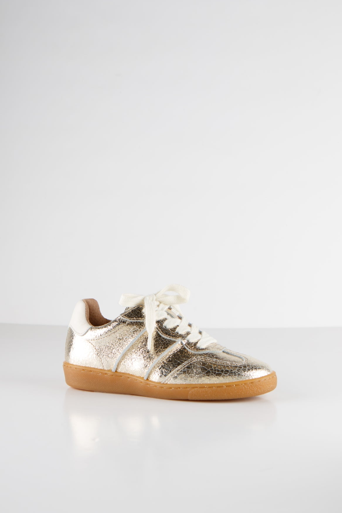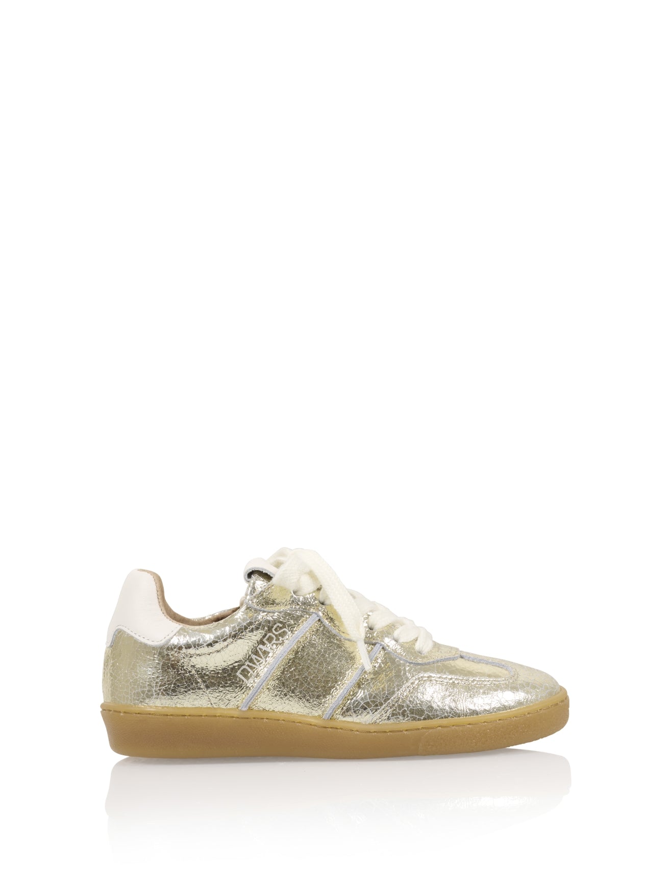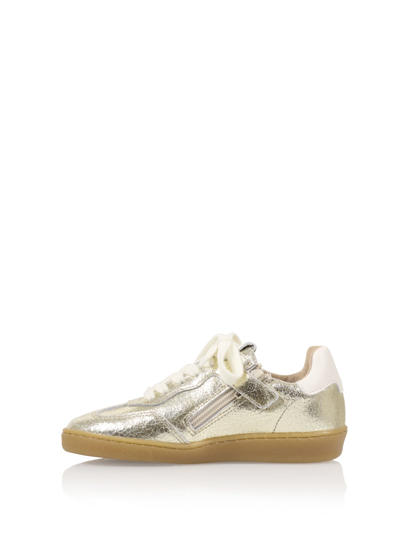 Deze supertrendy sneakers met lage zool zijn helemaal van nu. De Poona sneaker in de kleur champagne, met een crackled metallic finish en off-white details, is een echte must-have die moeiteloos bij elke outfit past.