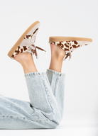The Nome slip-on sneaker with double laces is a real eye-catcher! By untying the laces at the front, you can adjust the sneaker and slip it on easily. The back edging keeps your foot comfortably in the shoe while walking. The sneaker is made of suede with a cow print on the outside and leather on the inside. Will you join this new trend?