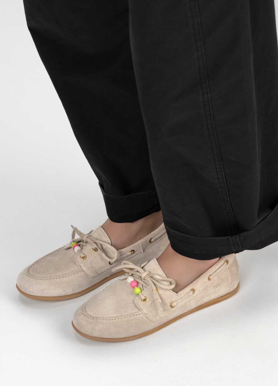 The sand-colored Latty moccasin is a wardrobe essential! It has a flat sole with drawstrings at the front for a tighter fit. The Latty is made of leather on the inside and suede on the outside, making it a walk-on shoe. It looks great with linen trousers or a long dress.