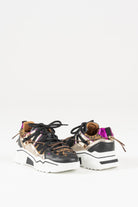 The Orion sneaker is new at DWRS. A sneaker with a high/thick sole like this one is a must-have for your shoe collection. This women's sneaker features a leather and metallic exterior and a full leather interior. The thin laces extend up to the heel, so you'll definitely stand out! Are you on trend?