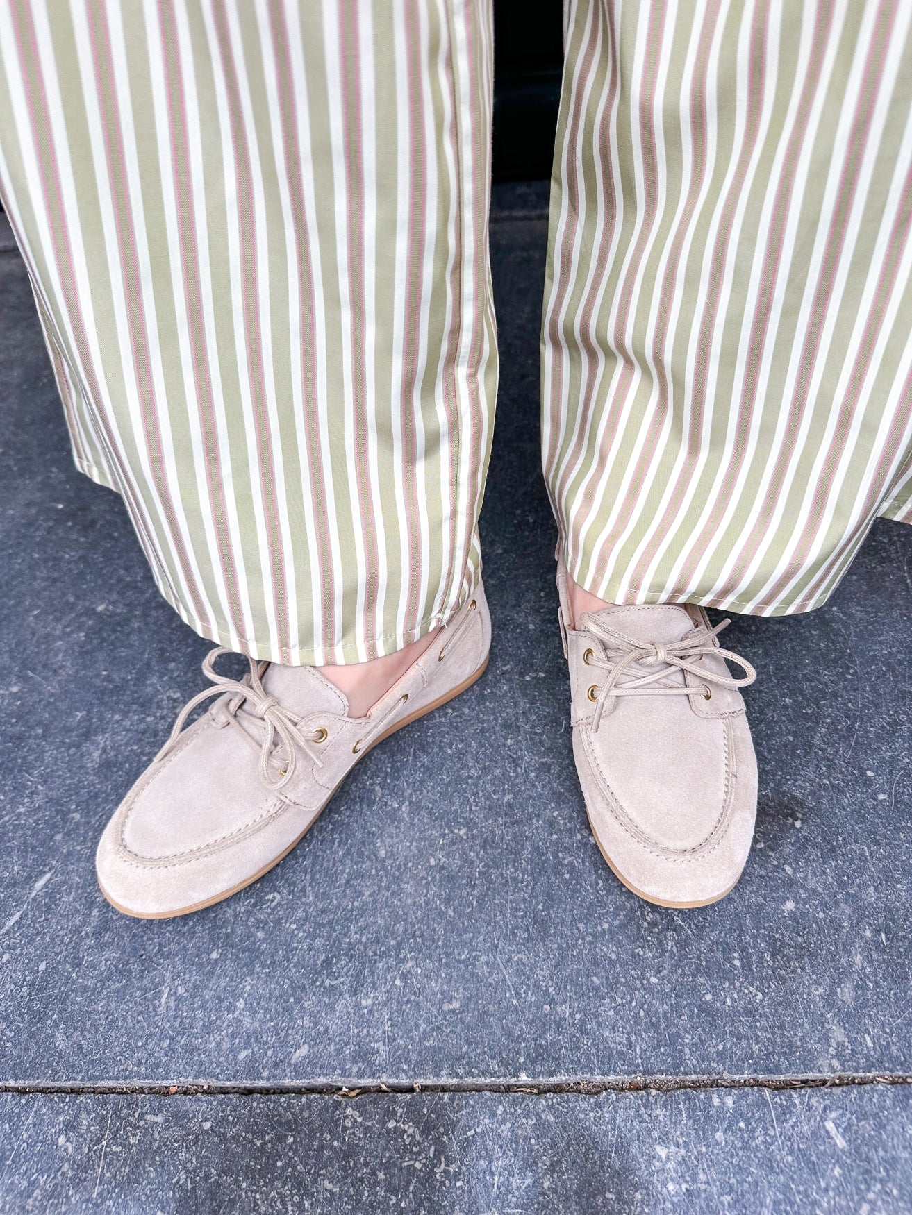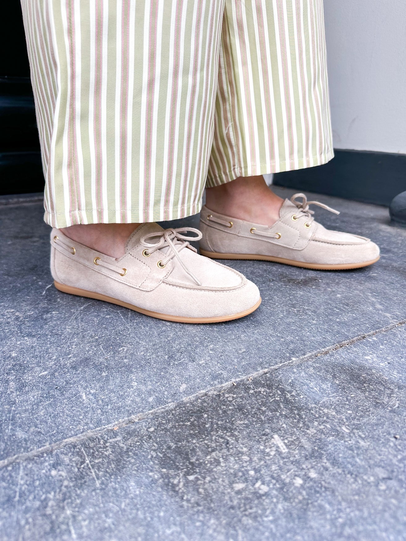 The beige Latty moccasin is a wardrobe staple you can wear year-round. It features a flat sole and drawstrings at the front for a more comfortable fit. The Latty is made of suede on the outside and comfortable leather on the inside, making it a walk-on shoe. It looks great with linen trousers or a long dress.