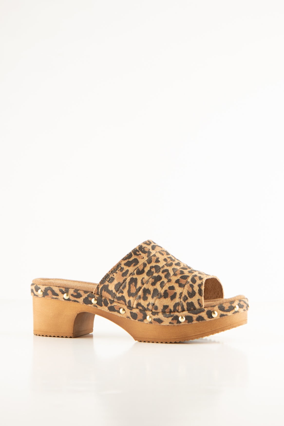 Het design kenmerkt zich door de open instap met een brede band en een opvallende leopard print. De studs langs de zoolrand en de robuuste houten blokhak geven de schoen een stoere en edgy touch.