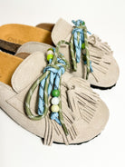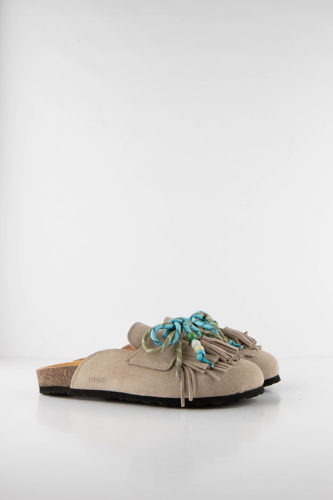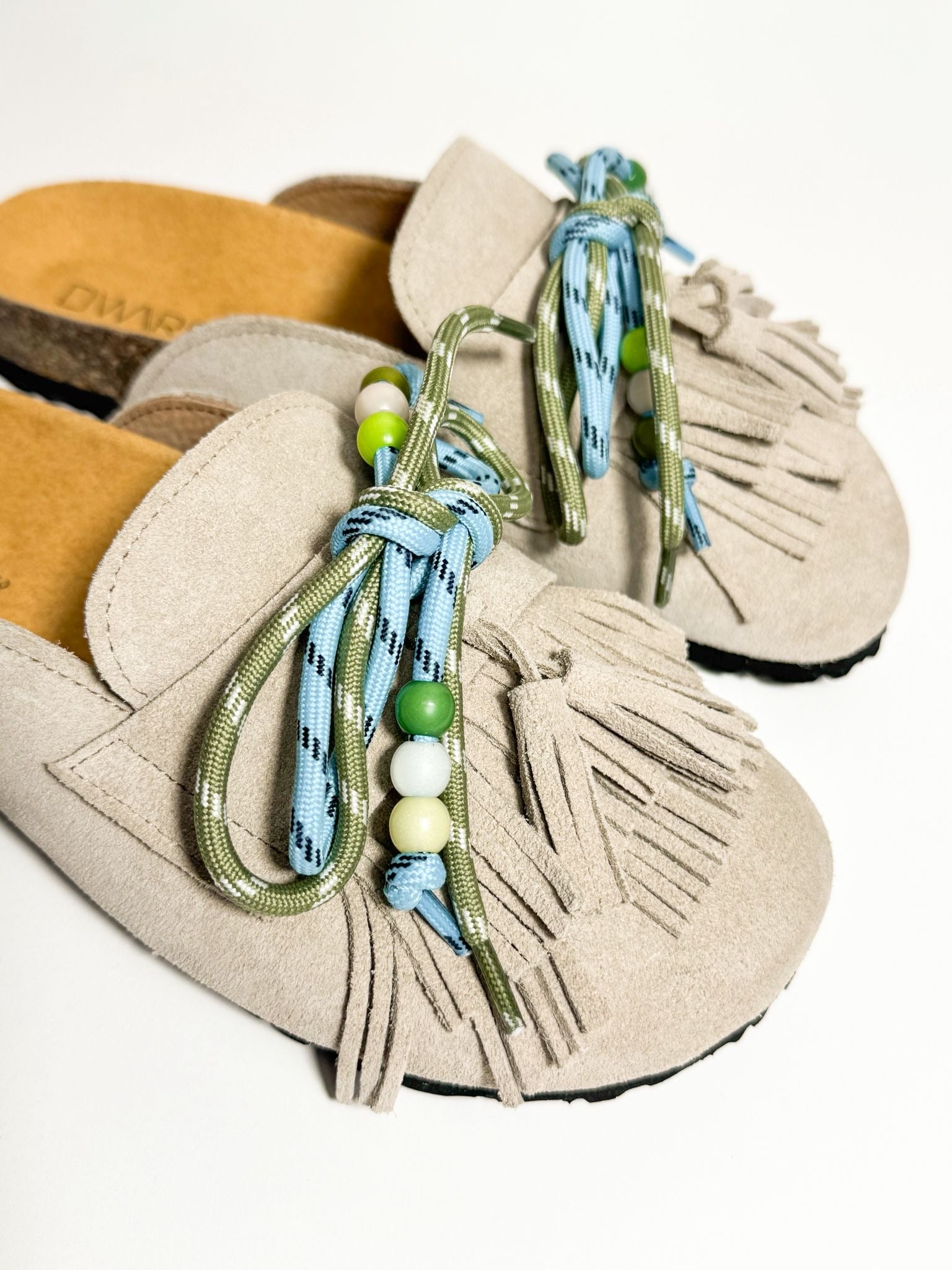 Het design valt op door de instapvorm met speelse veters, subtiele franjes en kleurrijke kraaltjes. Deze details geven de slipper een unieke, bohemian uitstraling en maken elke outfit net wat specialer.