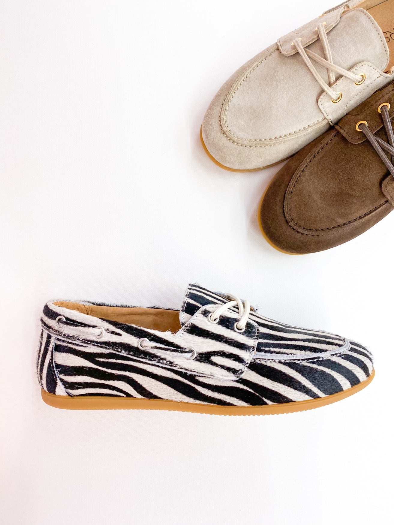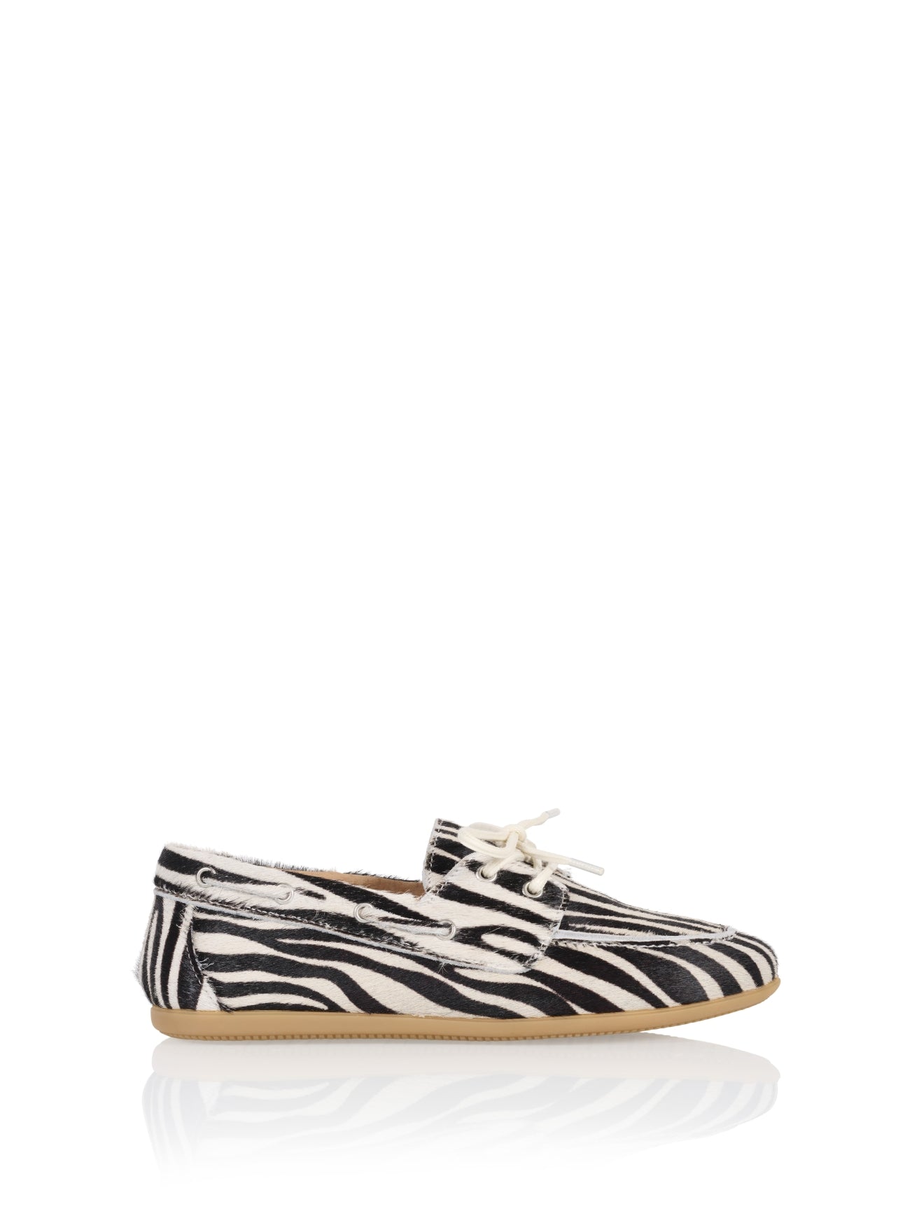 The zebra-print Latty moccasin is a wardrobe must-have and perfect for year-round wear. It features a flat sole and drawstrings at the front for a more comfortable fit. The Latty is made of suede on the outside and comfortable leather on the inside, making it a walk-on shoe. It looks great with linen trousers or a long dress.