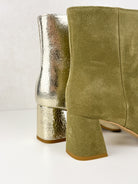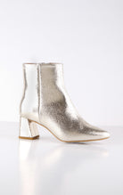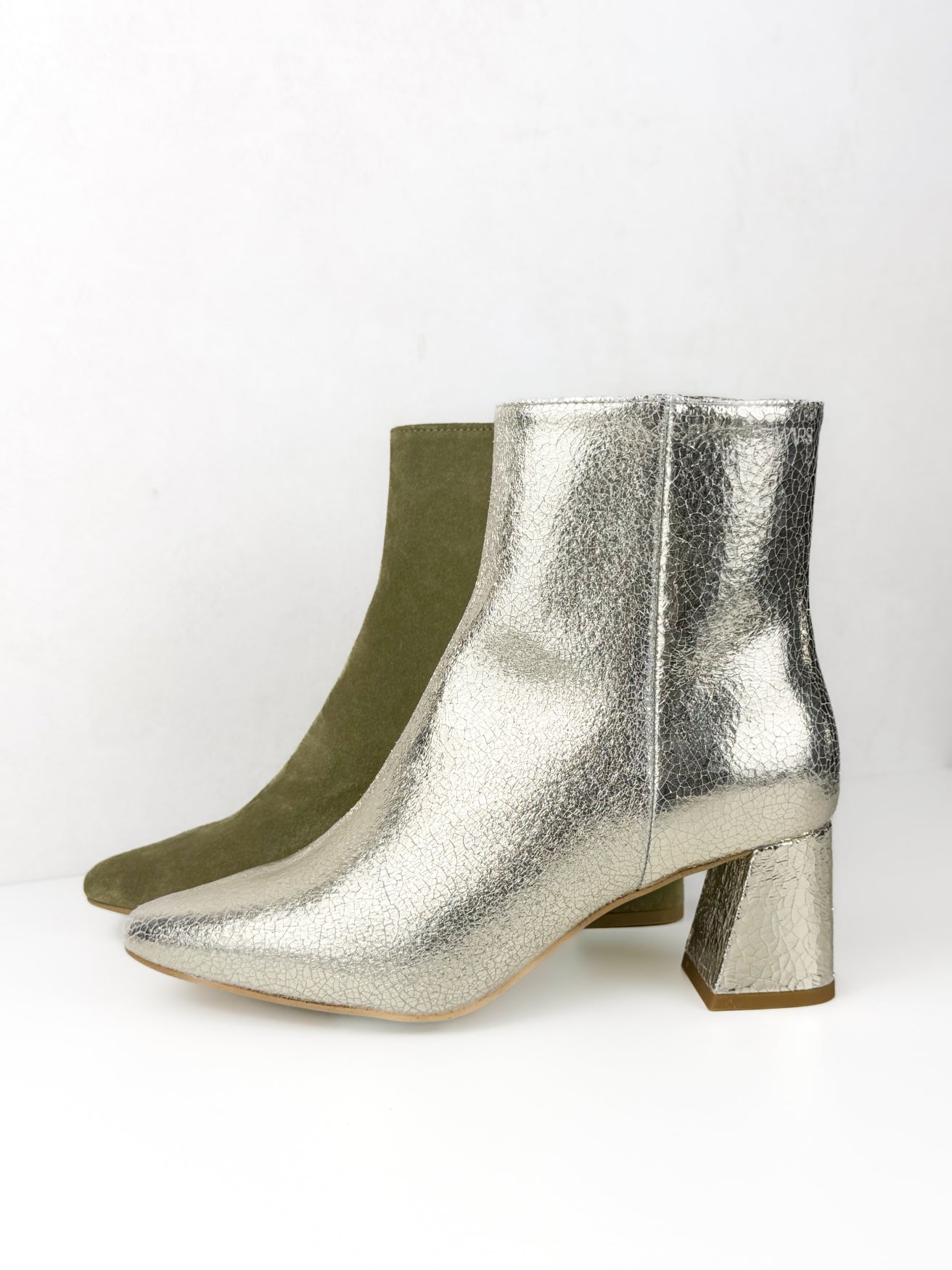 Deze enkellaarsjes met blokhak zijn aan de buitenkant gemaakt van crackled metallic en aan de binnenzijde van leer. Door de blokhak loop je op wolkjes op deze enkelaarsjes. Combineer met een stoere jeans of een jurkje en je bent ready to go!