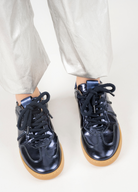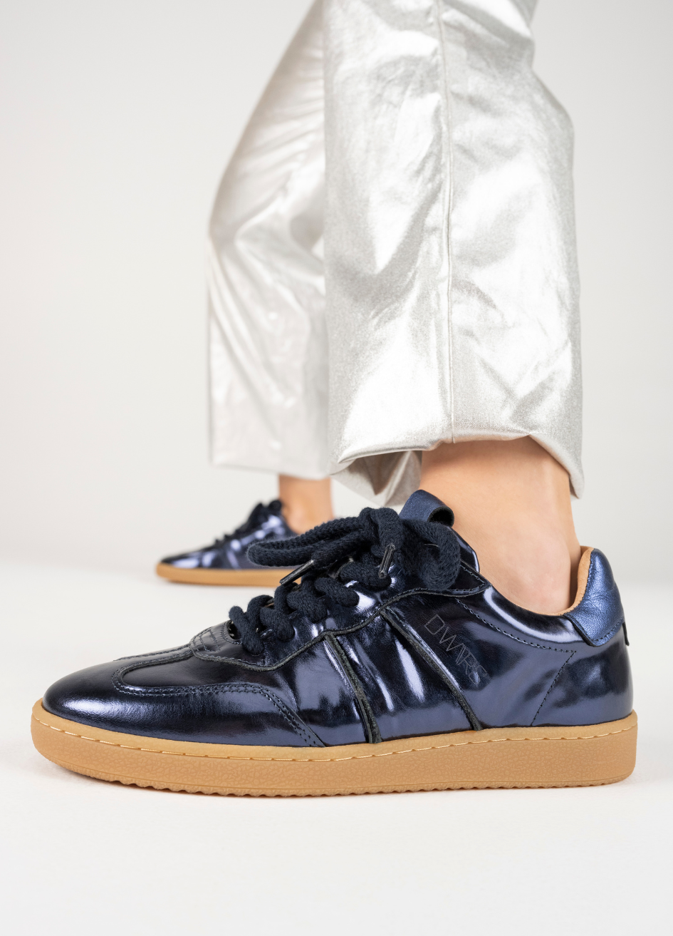 Deze te gave metallic sneakers met lage zool zijn een absolute trend van nu! De Poona sneaker met opvallende navy metallic kleur is een musthave voor in je kast. De sneaker is aan de buitenzijde gemaakt van metallic en aan de binnenzijde gemaakt van leer.